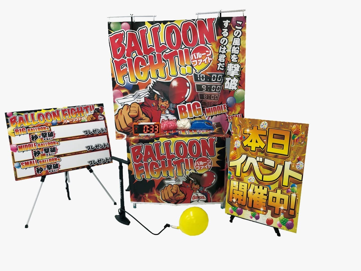 〇専用テーブル(W900×D600×H700㎜) 〇テーブルクロス 〇背景大型POP(W1500×H1300㎜)&ハンガーセット 〇大型タイマー 〇空気入れ&空気入れ部品(2種) 〇ウォーターウエイト(2個) 〇イーゼル(2台) 〇書き込みA1パネル 〇オリジナルA1パネル 〇風船 (3種 大: 50個 ・ 中: 100個 ・ 小: 100個) 〇工具