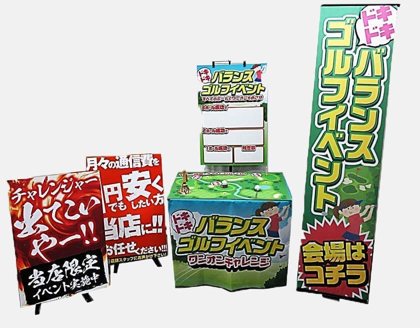 〇専用テーブル (W900×D600×H700㎜) 〇テーブルクロス 〇3ホールチャレンジボード 〇書き込みA1パネル&ハンガーセット 〇オリジナルA1パネル(2種) 〇イーゼル(2台) 〇ロングPOP&ハンガーセット 〇ゴルフボール(3個) 〇スプーン(2個) 〇ワンオンティ(切株ティ x 1・ゴムティ x 1・木製ティ x 2) 〇大当たりベル 〇ウォーターウエイト(2個) 〇工具