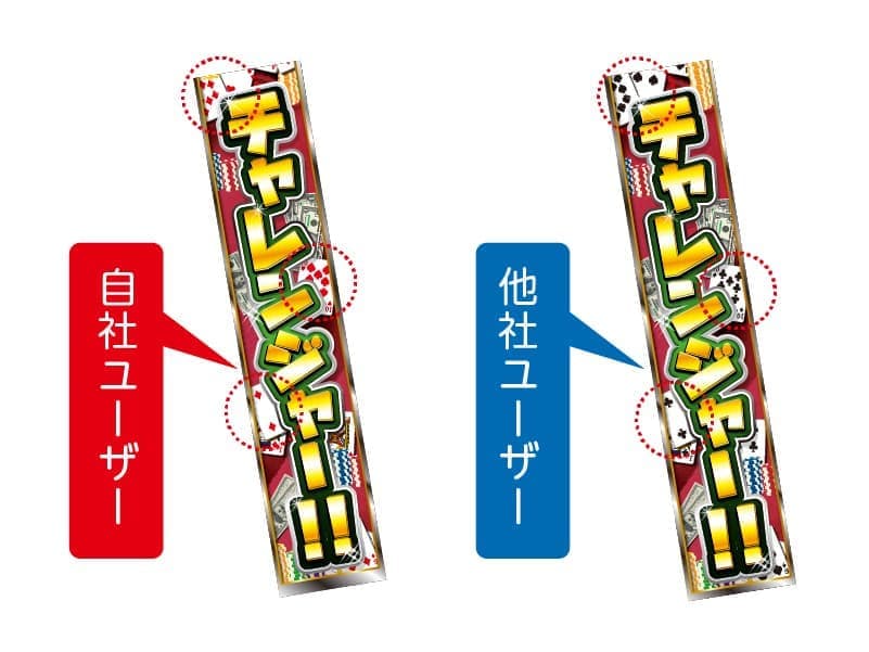 お客様のケータイを拝見し、自社ユーザーなら左側たすき、他社ユーザーなら右側たすきをかけて頂く様に誘導下さい。チャレンジ終了後に各々のお客様へ違ったアプローチが行えます。